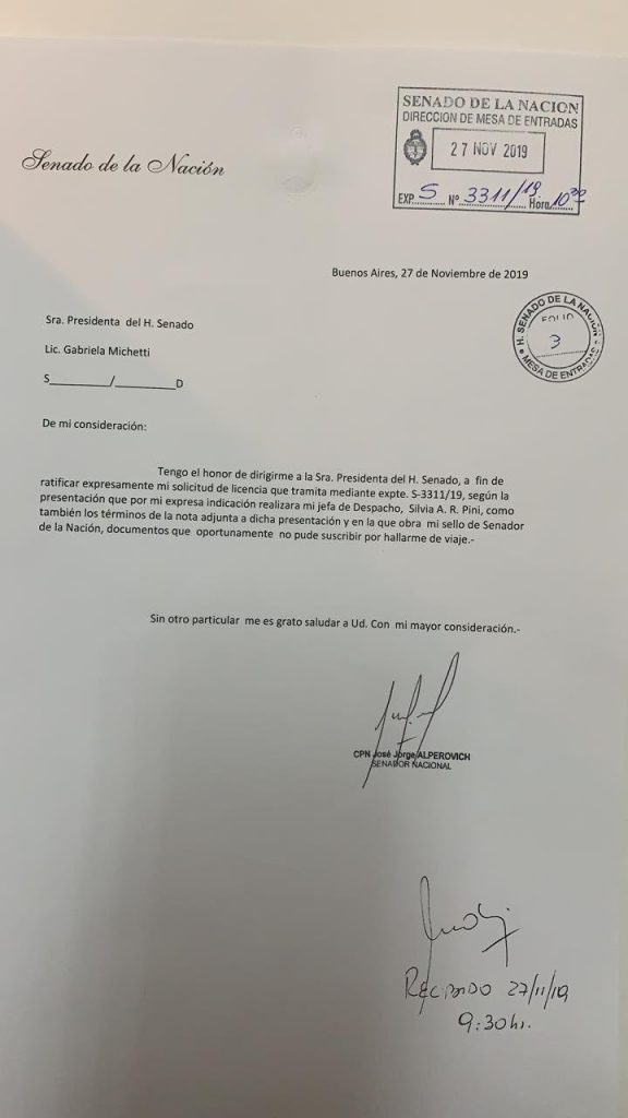 Si bien el dirigente peronista había anticipado que suspendería su actividad legislativa, ahora lo oficializó con una carta hacia la titular del Senado, Gabriela Michetti: “Tengo el honor de dirigirme a la Sra. Presidenta del H. Senado, a fin de ratificar expresamente mi solicitud de licencia, según la presentación que por mi expresa indicación realizara mi jefa de despacho, como también los términos de la nota adjunta a dicha presentación y en la que obra mi sello de Senador de la Nación, documentos que oportunamente no pude suscribir por hallarme de viaje”.